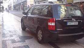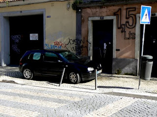 O que aqui se vê não é grave, mas merece uma referência porque é uma situação que ali se pode ver todos os dias: esta carrinha VW tem um lugar reservado para si ("deficientes") mas, simpaticamente (ou porque é forçado a tal), o seu condutor cede metade do seu espaço a outros - uma generosidade-da-treta, dado que é feita à custa do espaço dos peões...