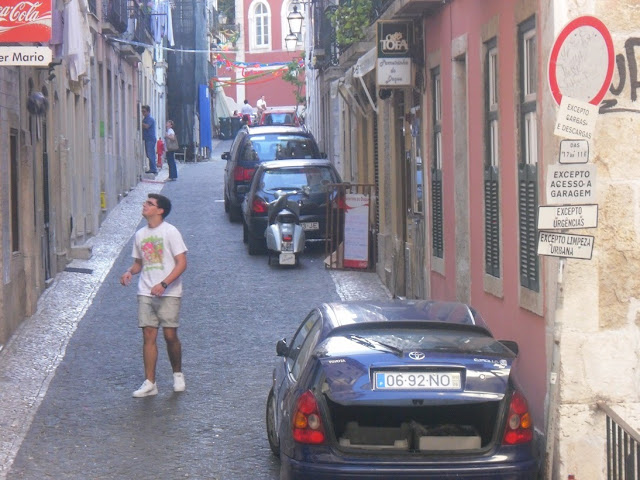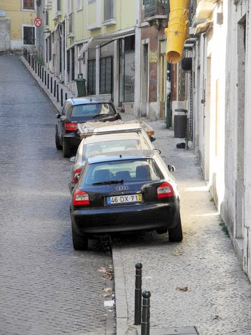 Vindos de Alfama, estes turistas podem apreciar, na Calçada do Forte, este verdadeiro concentrado de caos & impunidade tipicamente alfacinha: estacionamento no passeio, em passadeira para peões e em rua de trânsito proibido - e tudo isso em poucos metros, e a crédito de um profissional da nossa praça, claro!