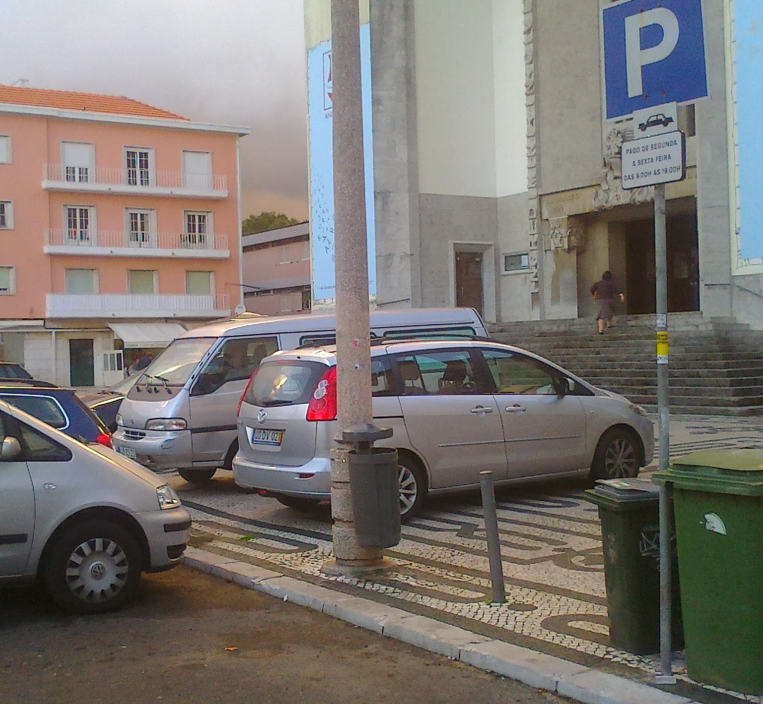 Veja-se o pormenor do estacionamento à esquerda, com os carros a obstruírem o passeio, apesar dos lugares de estacionamento estarem pintados na faixa de rodagem.